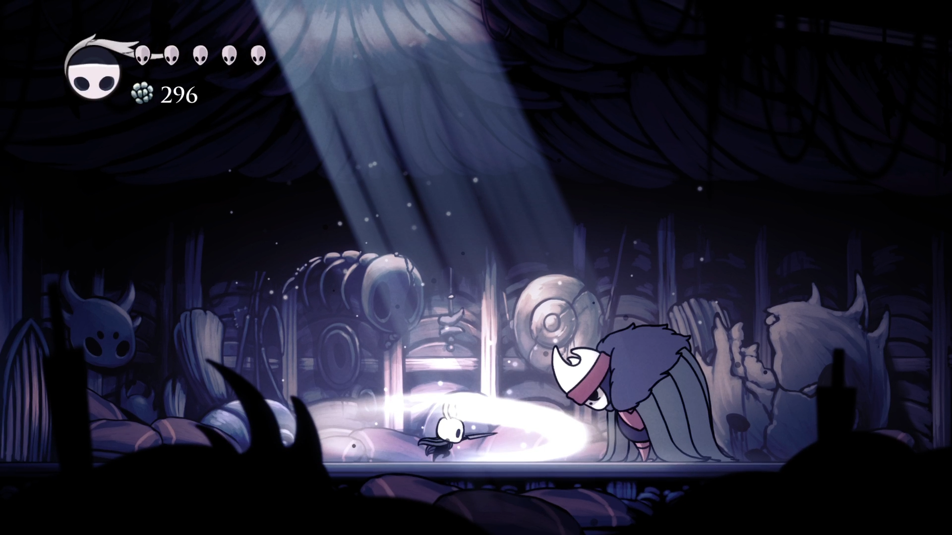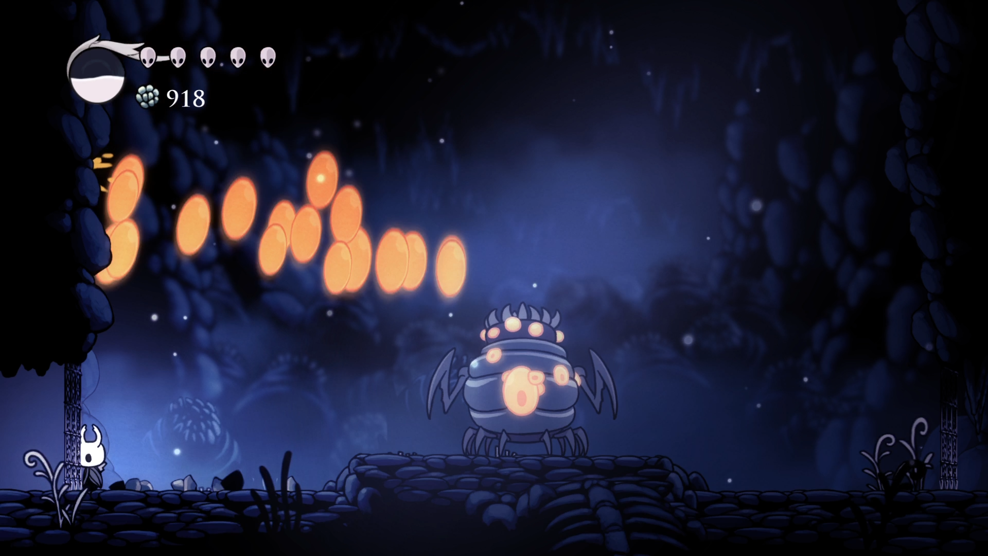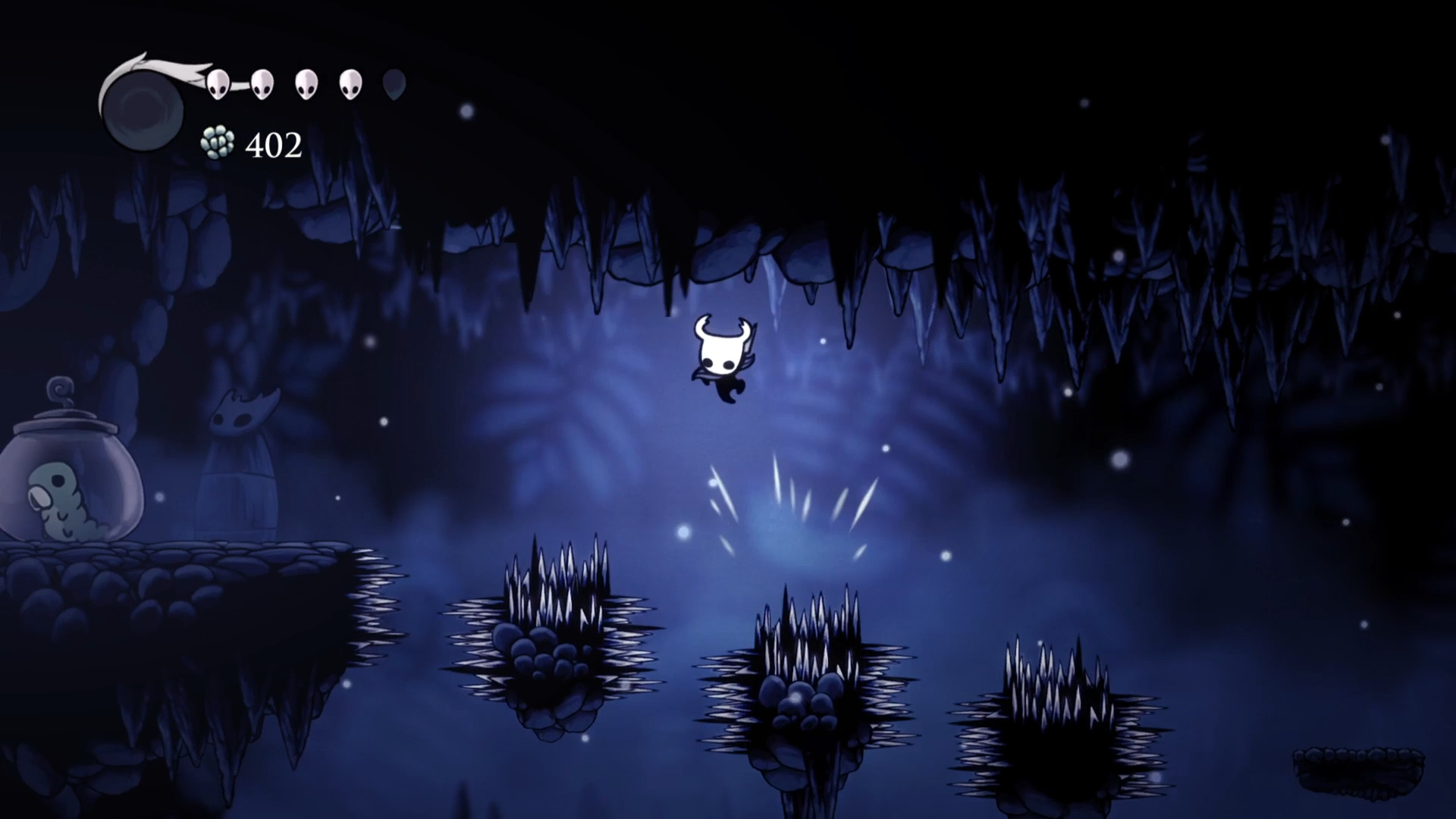 Первым делом спас пару гусеничек в Перепутье, хотя, на самом деле, я мог забрать их и раньше, просто не догадался как именно. К первой надо было пропрыгать, отталкиваясь гвоздем от шипов. А вторая была скрыта за хрупкой стеной, которую я не заметил при первом посещении локации. Сейчас же нашел случайно, ориентируясь на характерный звук гусеничек.