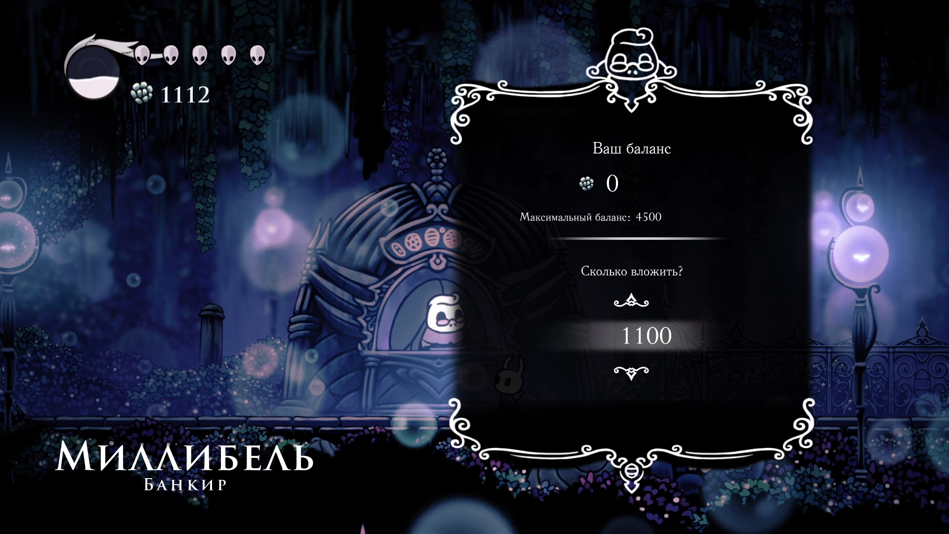 Дальше я поехал в Грибные пустоши, а если быть точным - на Вокзал королевы. На самом вокзале собрал еще один осколок маски, который раньше не мог взять без Клешни богомола, и пошел в этот раз налево в Туманный каньон. Здесь встретил НПС - банкира. Открыл счет за 100 Гео, на котором можно сохранить до 4500 Гео, которые не сгорают при смерти. Очень полезная функция!
