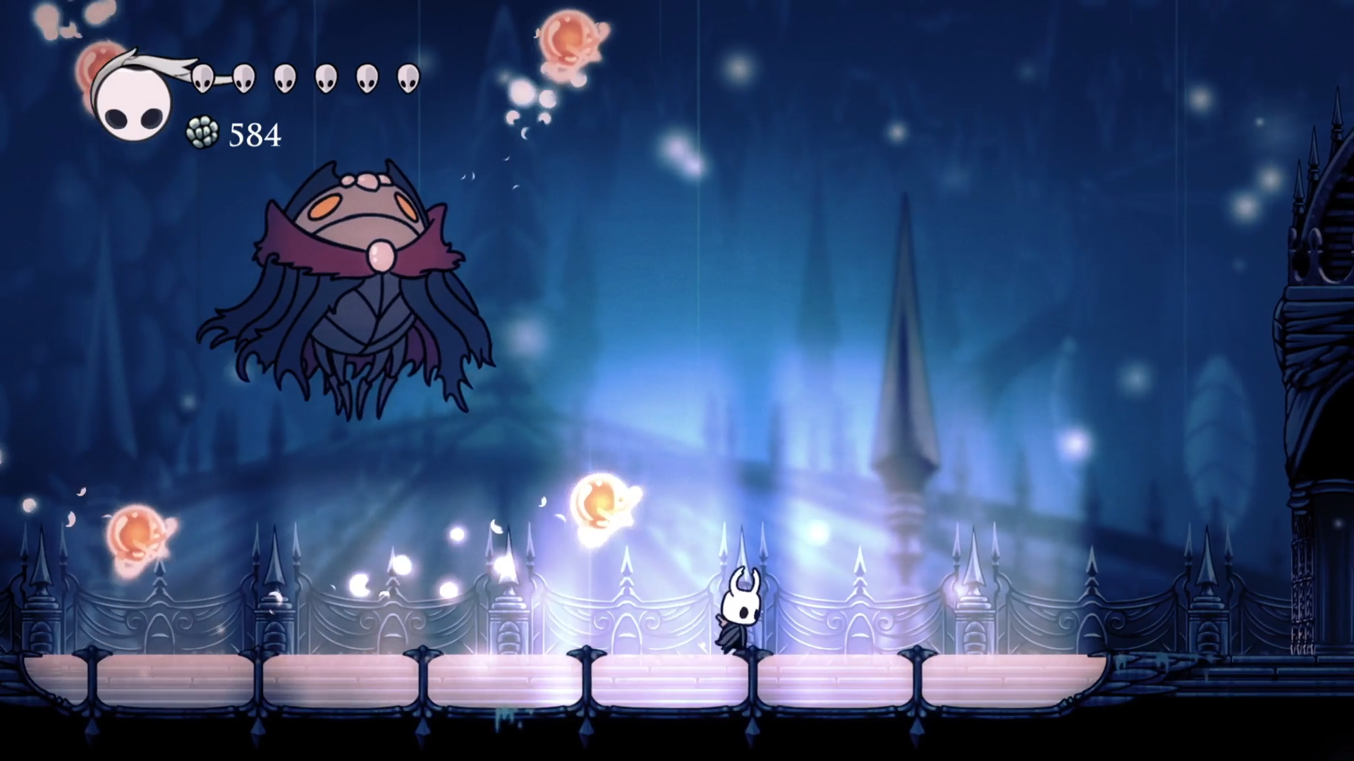 И вскоре я добрался до апогея всего самого раздражающего в этой локации - босс Мастер душ. Подобно тем летающих мразотам он телепортировался и стрелял наводящимися шарами, делал стремительную пикирующую атаку сверху вниз, от которой расходятся ударные волны по земле, делал пролет по локации, окружая себя вращающимися шарами и делал рывок по земле. Но самое неожиданное - это вторая фаза, при переходе на которую Мастер пробил на арене и мы упали в яму, где он начал бесконечно спамить пикирующими атаками, а потом встал на одном месте и начал забрасывать шарами. В целом, сражение крутое. Но впечатления были заранее подпорчены летающими жуками. Кстати, за победу меня наградили новым заклинанием. Теперь я могу делать такой же магический рывок вниз, наносящий урон врагам и пробивающий хрупкий пол. А это значит, теперь я смогу попасть в еще большее количество мест.
