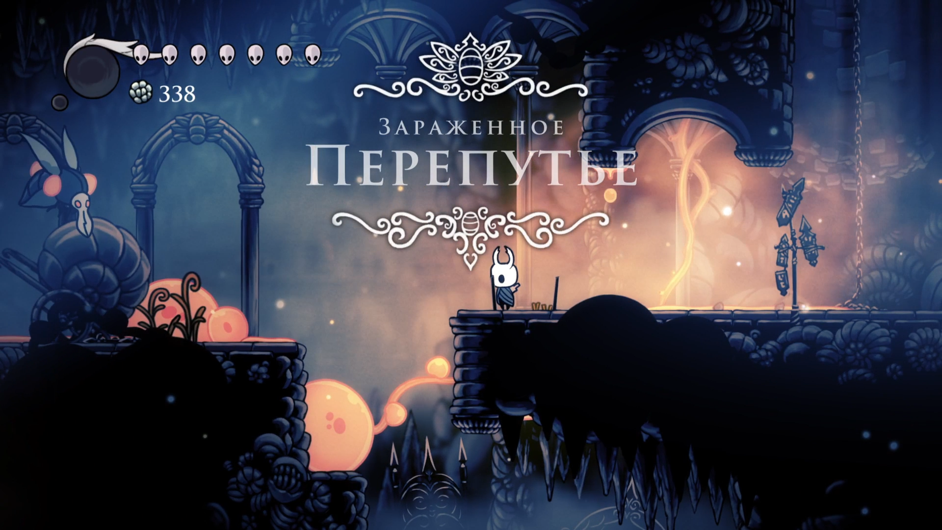 В перепутье появились новые зараженные враги, а некоторые проходы стали недоступны. Все новые враги еще и взрываются после смерти, а вот эти мухи слева взрывом отнимают аж 2 маски. Мой путь пролегал на восток, где, во-первых, я заглянул к Салюбре и купил последнюю ячейку для амулетов. А во-вторых наконец-то применил Проездной из Глубинного гнезда и смог прокатиться на трамвае, который привел меня в Земли Упокоения.