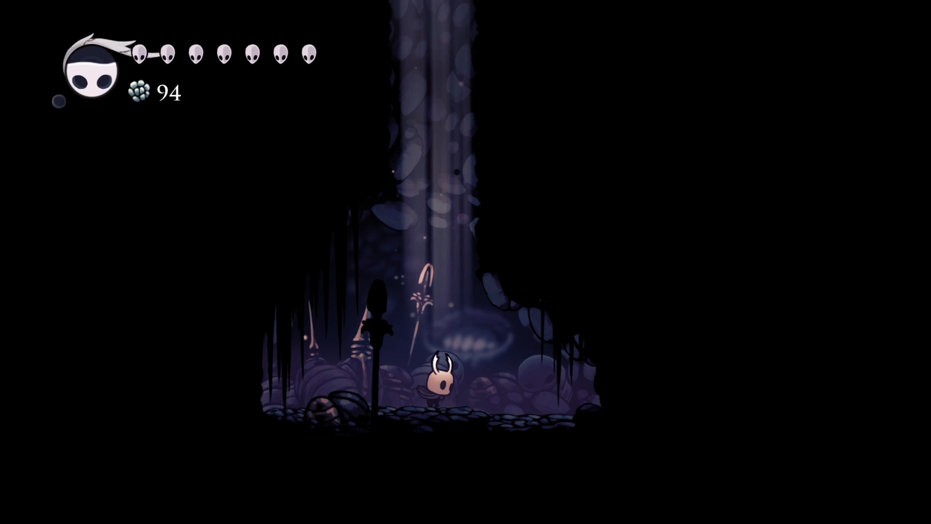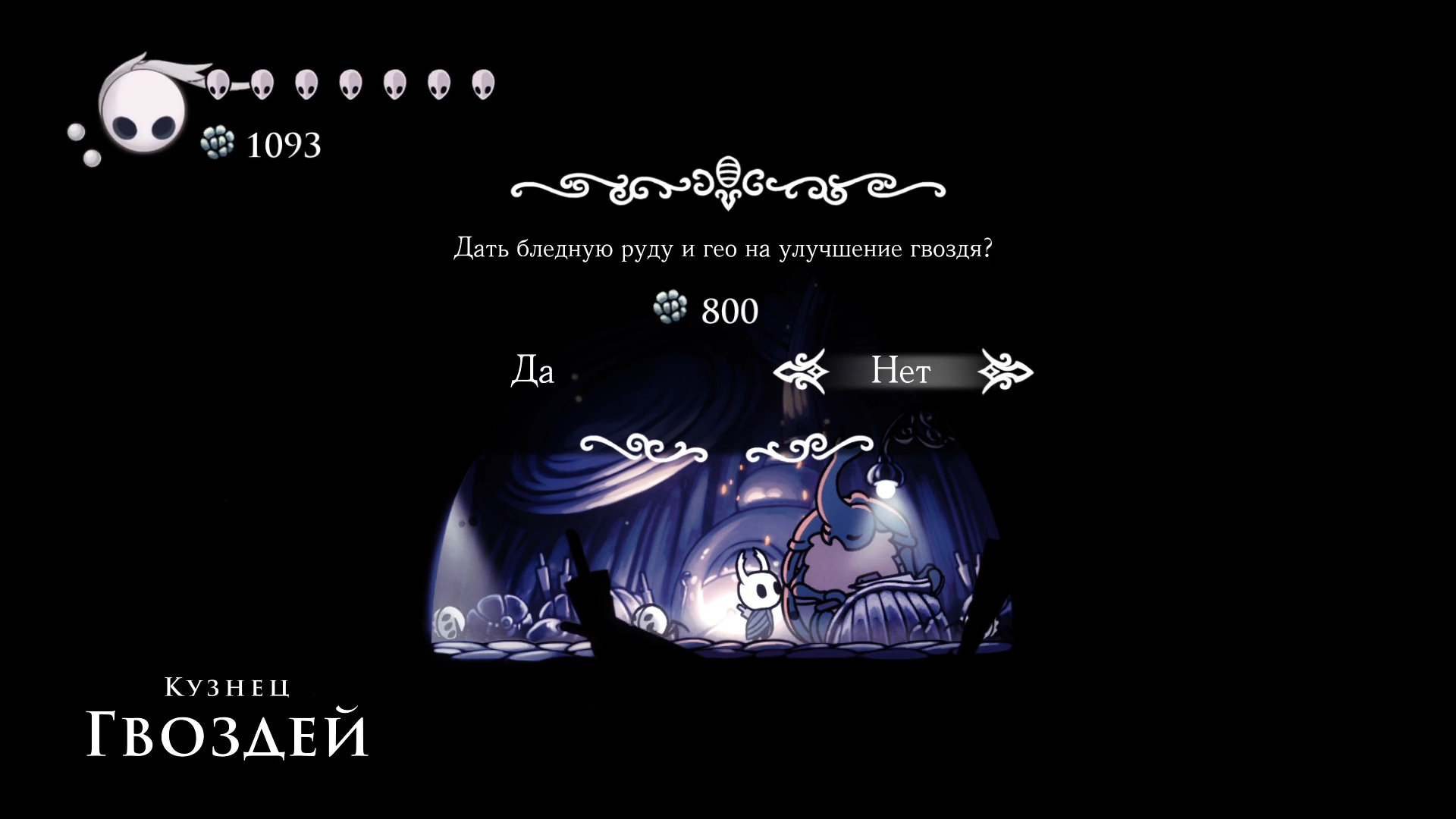 Отсюда я решил вернуться в Город Слез обычным путем и навестить Кузнеца, чтобы прокачать Гвоздь. За апгрейд Кузнец содрал с меня 800 Гео и кусок бледной руды. На следующую заточку понадобится уже 2 куска руды и 2000 гео. Бабки, как говорится, не проблема, всегда можно нафармить. А вот бледная руда ресурс крайне редкий, будем искать.