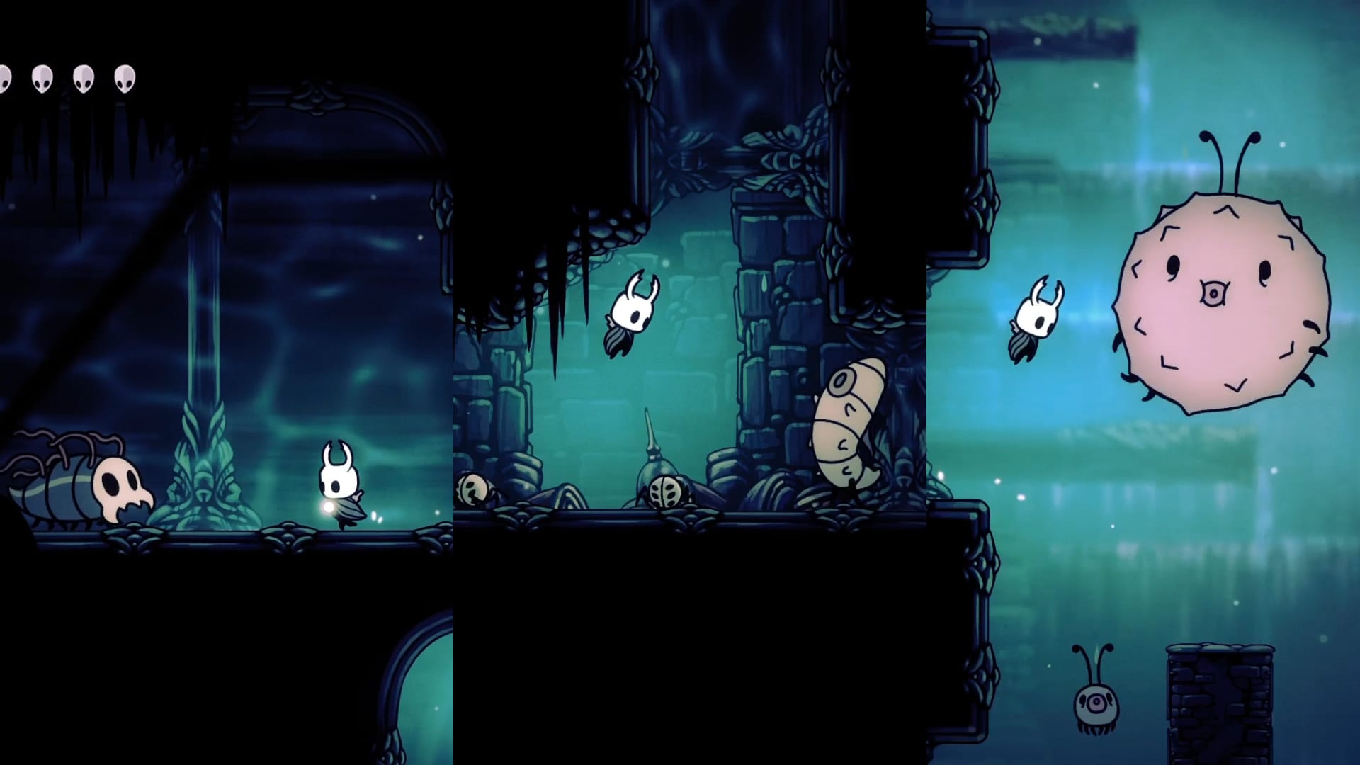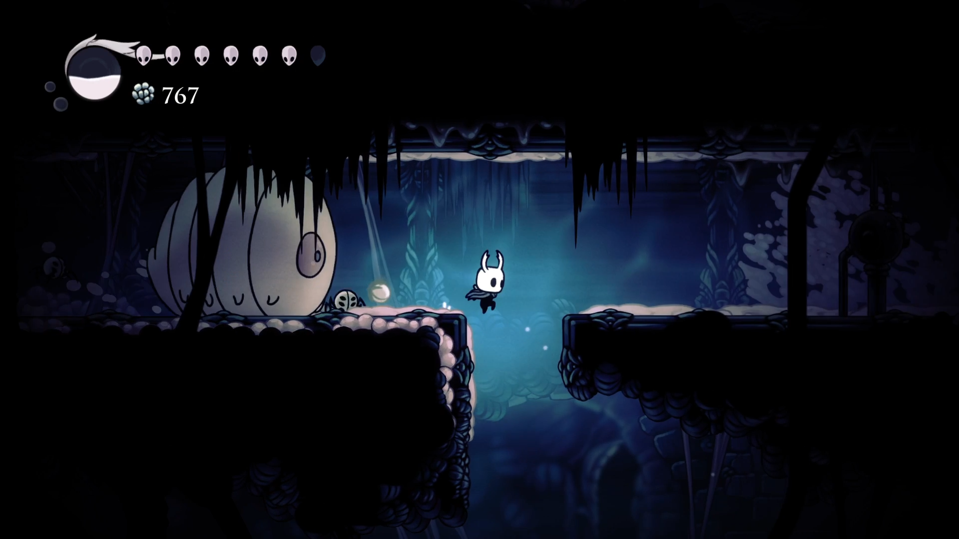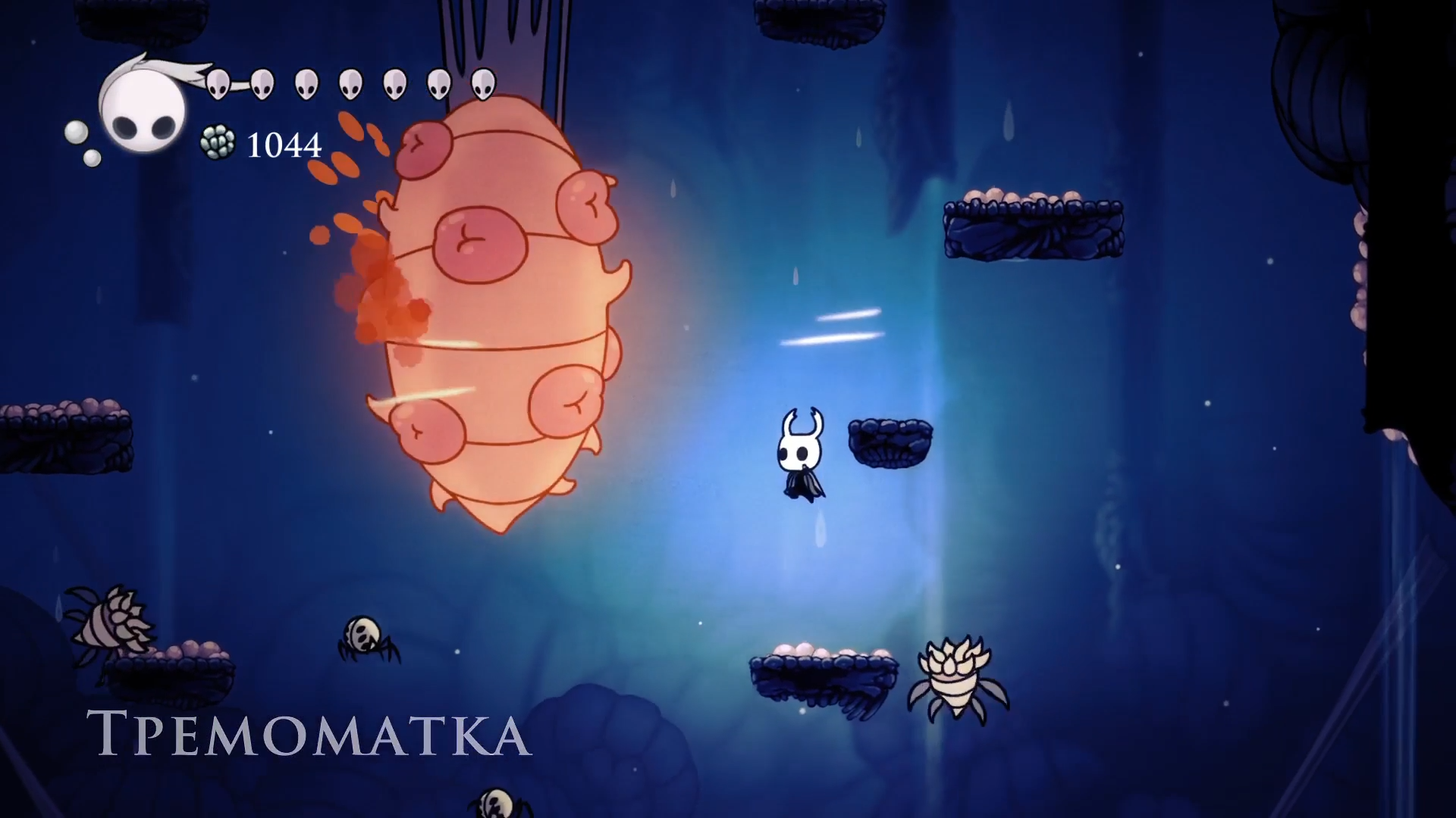 За пол часа исследования локации я обнаружил огромного жука, продающего тухлые яйца, скамейку, гусеничку за хрупкой стеной, осколок маски и картографа. Больше всего обрадовался последнему. Двигаясь по карте забрел в тоннели с огромными белыми слизняками, который начинают нестись на рыцаря только завидев его и отнимают 2 маски урона касанием. Не самые сложные враги, но безопасный бой с ними ставится довольно затяжным.